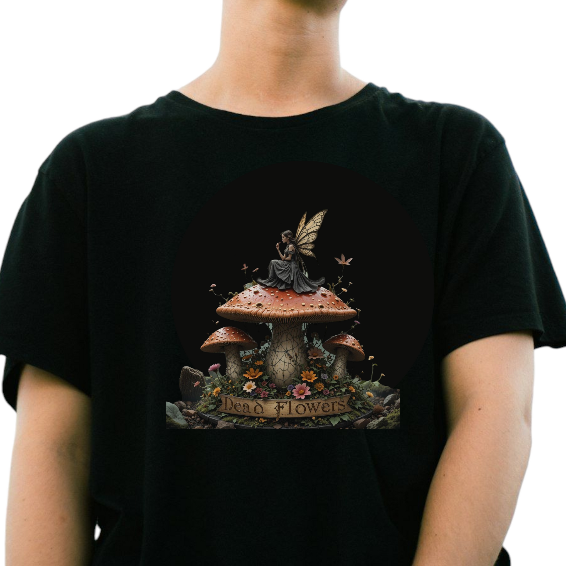 Dead Flowers Gothic Fairy Mushroom T-Shirt, Black, Fantasy Woodland Art Design, Mystical Nature Print