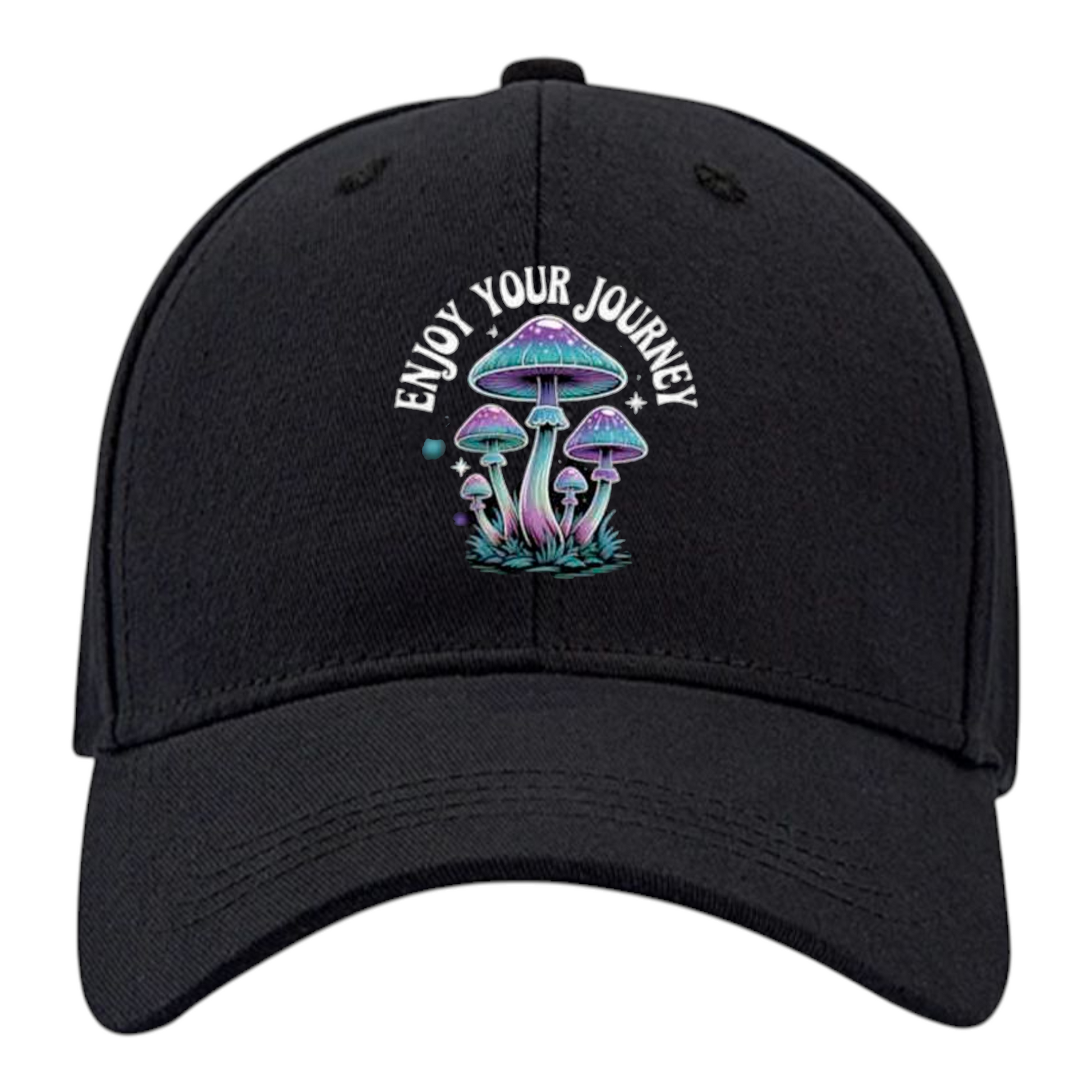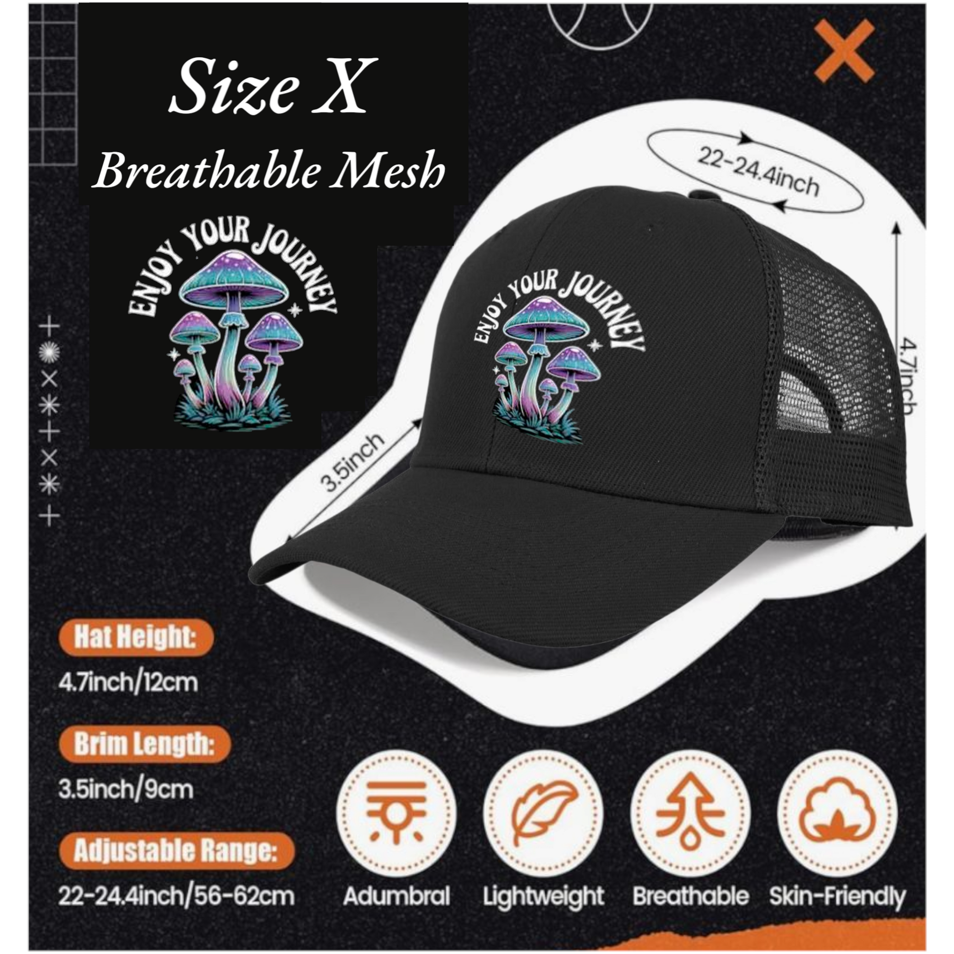 Enjoy Your Journey Mushroom Baseball Cap, Breathable Mesh Trucker Hat, Black, Adjustable 22-24.4 inch