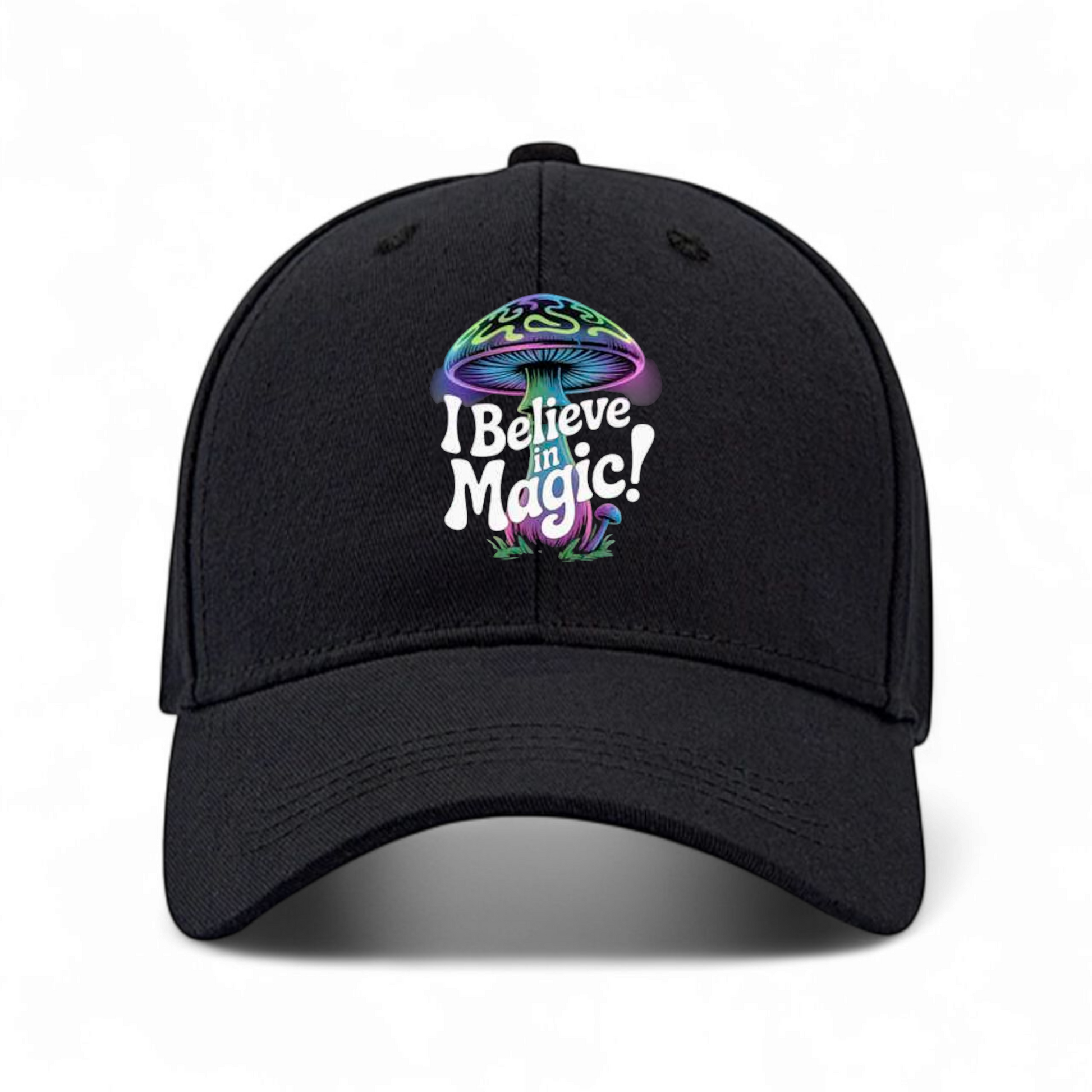 DESIGN FEATURES: Black mesh construction with vibrant rainbow psychedelic mushroom graphic and 'I Believe in Magic' text